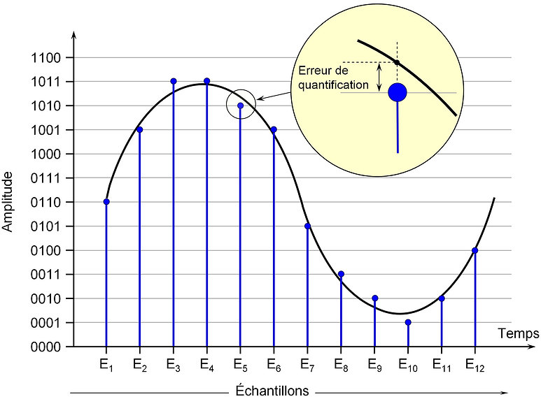 La valeur réelle d'amplitude de l'onde est toujours comprise entre 2 possibilité d'echantillonnage, le niveau codé sera le plus proche de la valeur d'échantillonnage possible. Chaque approximation engendre une erreur de quantification, qui a comme valeur maximale de la moitié de l'amplitude entre les deux possibilités d'echantilllonnage encadrant ce moment.