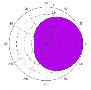 C’est l'une des directivités la plus utilisée en prise de son, elle rejette quasiement tout ce qu’il y a à l’arrière du micro avec un taux de réjection maximum à 90° et à 270° Le diagramme violet reprensente la sensibilité dans le plan, une sensibilité de 1 ( ou 100%) dans l’axe du micro (0°), une sensibilité de 0,5 soit 50% sur les côtés et de 0 soit 0% à l’arrière du micro.